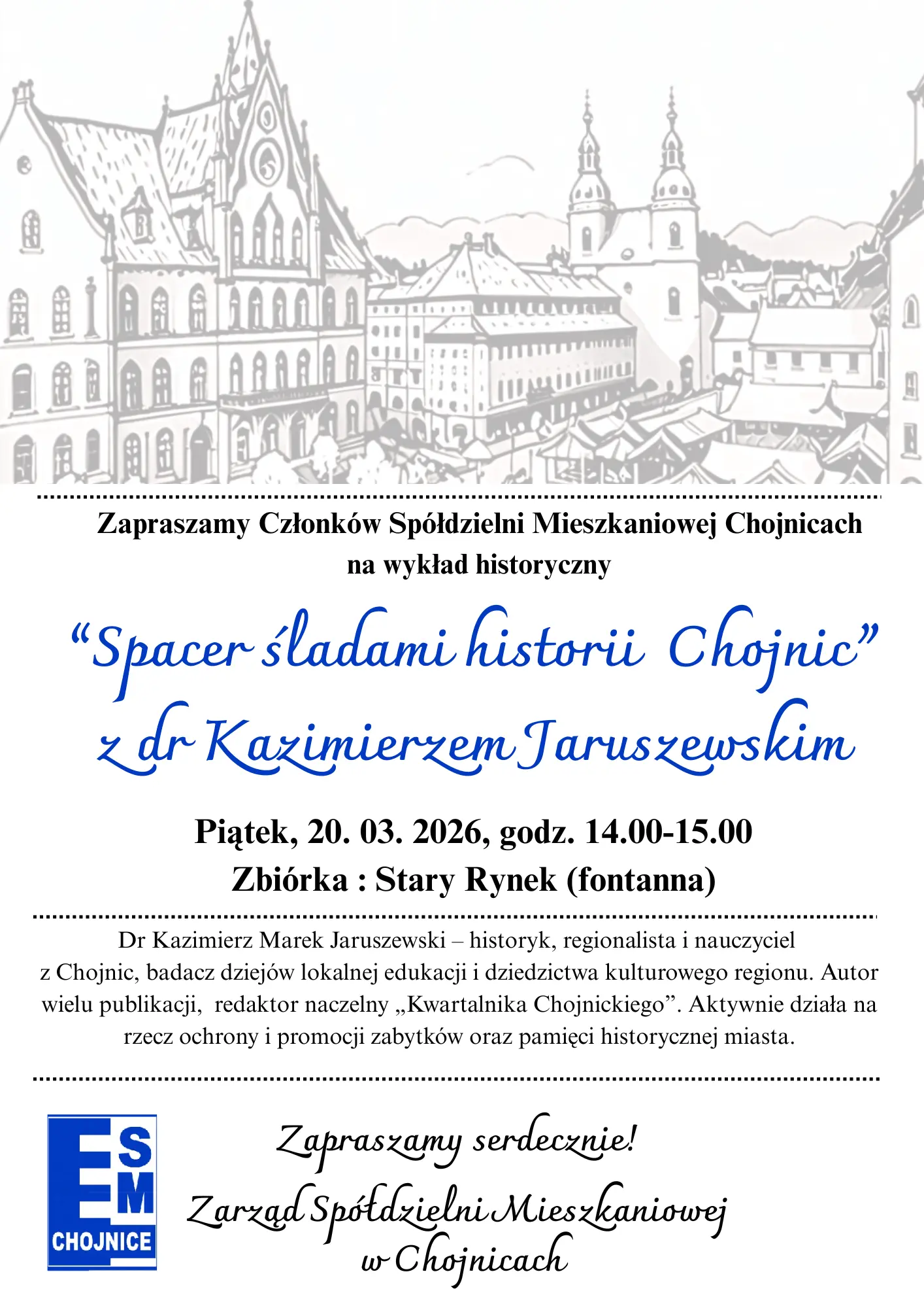 Wykład historyczny dla Członków Spółdzielni Mieszkaniowej w Chojnicach "Spacer śladami historii Chojnic" prowadzony przez dr Kazimierza Jaruszewskiego